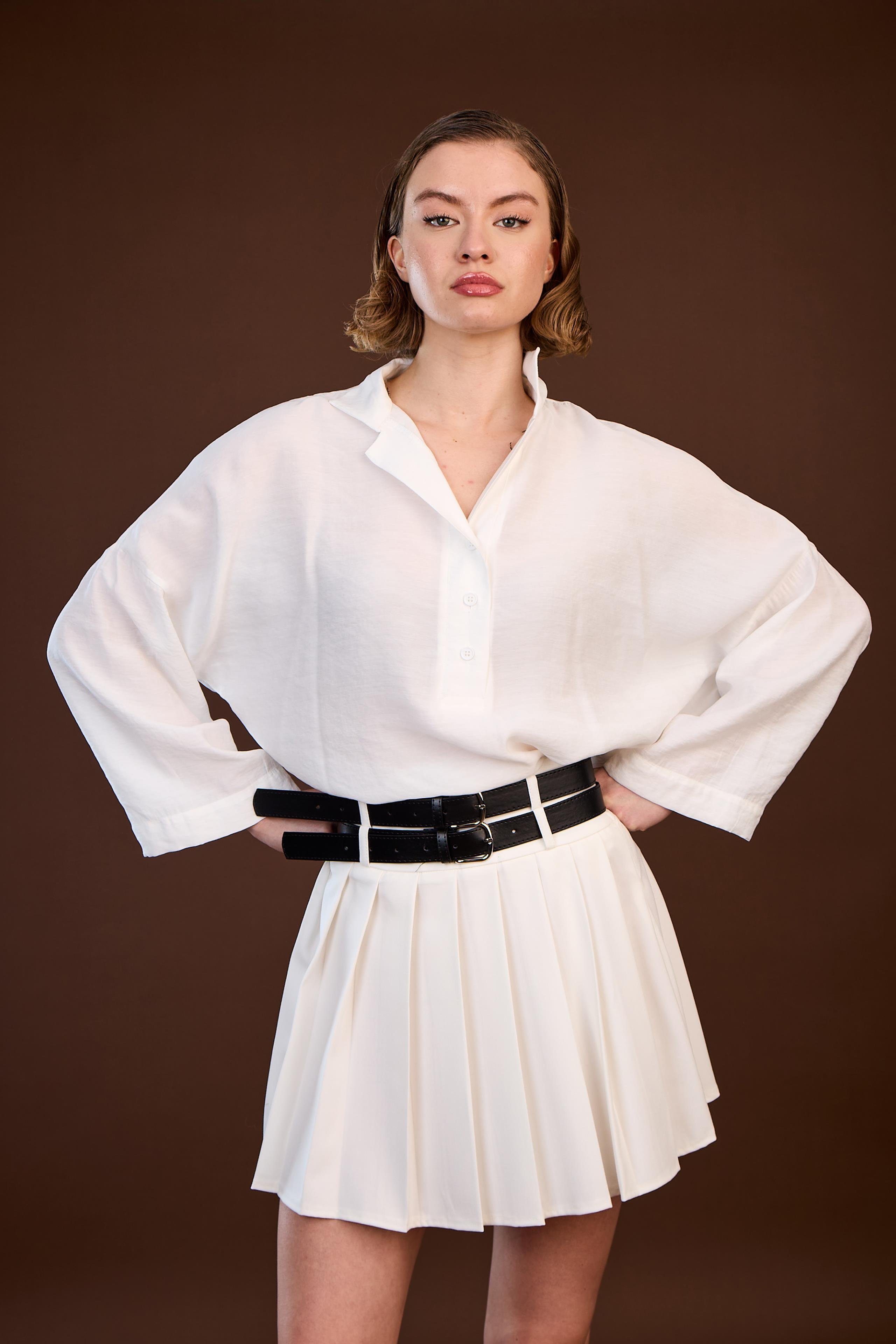 3239 PİLİLİ ÇİFT KEMERLİ ETEK BEYAZ